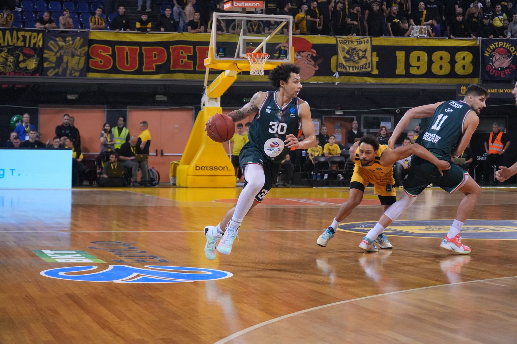 Premierowe punkty zdobyli gospodarze, a po nietrafionym rzucie za trzy Tymoteusza Sternickiego gracze Arisu zgubili piłkę. Trójkolorowi mieli na początku problemy z konstruowaniem akcji – Grecy to wykorzystywali i mecz rozpoczął się od serii 10:0. Przełanie nastąpiło po wykończeniu z góry Jakuba Urbaniaka. Pierwsze pięć minut wyglądało fatalnie pod względem skuteczności w ataku jeśli chodzi o ekipę z Wrocławia. Bardzo dobrą obroną wykazywała się wówczas drużyna trenera Igora Milicicia nie pozwalając Śląskowi na rzuty z łatwych pozycji. Przez blisko siedem minut WKS zdobył zaledwie cztery punkty – oglądając to spotkanie można było mieć wrażenie, że obręcz jest „zaczarowana”, przede wszystkim gdy przy rzutach piłka wykręcała się i wypadała z kosza. Aris natomiast w tej premierowej odsłonie trafił trzy trójki i zdobył bezpieczną przewagę w postaci aż 15 punktów.